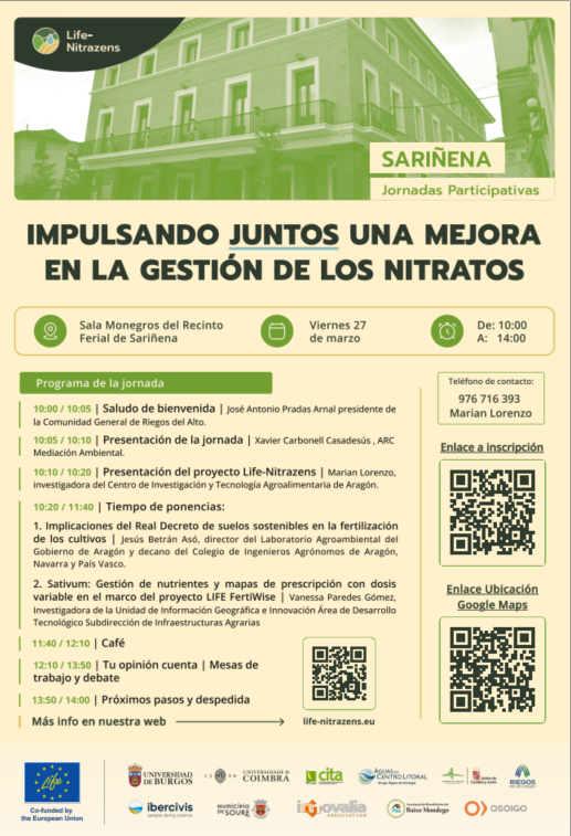 Nuestra compañera Vanessa Paredes Gómez, investigadora de la Unidad de Información Geográfica e Innovación de ITACyL, participará el próximo viernes 27 de marzo en la jornada participativa «Impulsando juntos una mejora en la gestión de los nitratos», organizada por el proyecto Life-Nitrazens en la Sala Monegros del Recinto Ferial de Sariñena (Huesca).